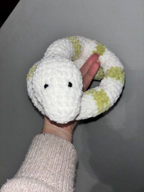 Voici Ernest, un serpent doux et câlin, né entre les fils et le calme de l’atelier.